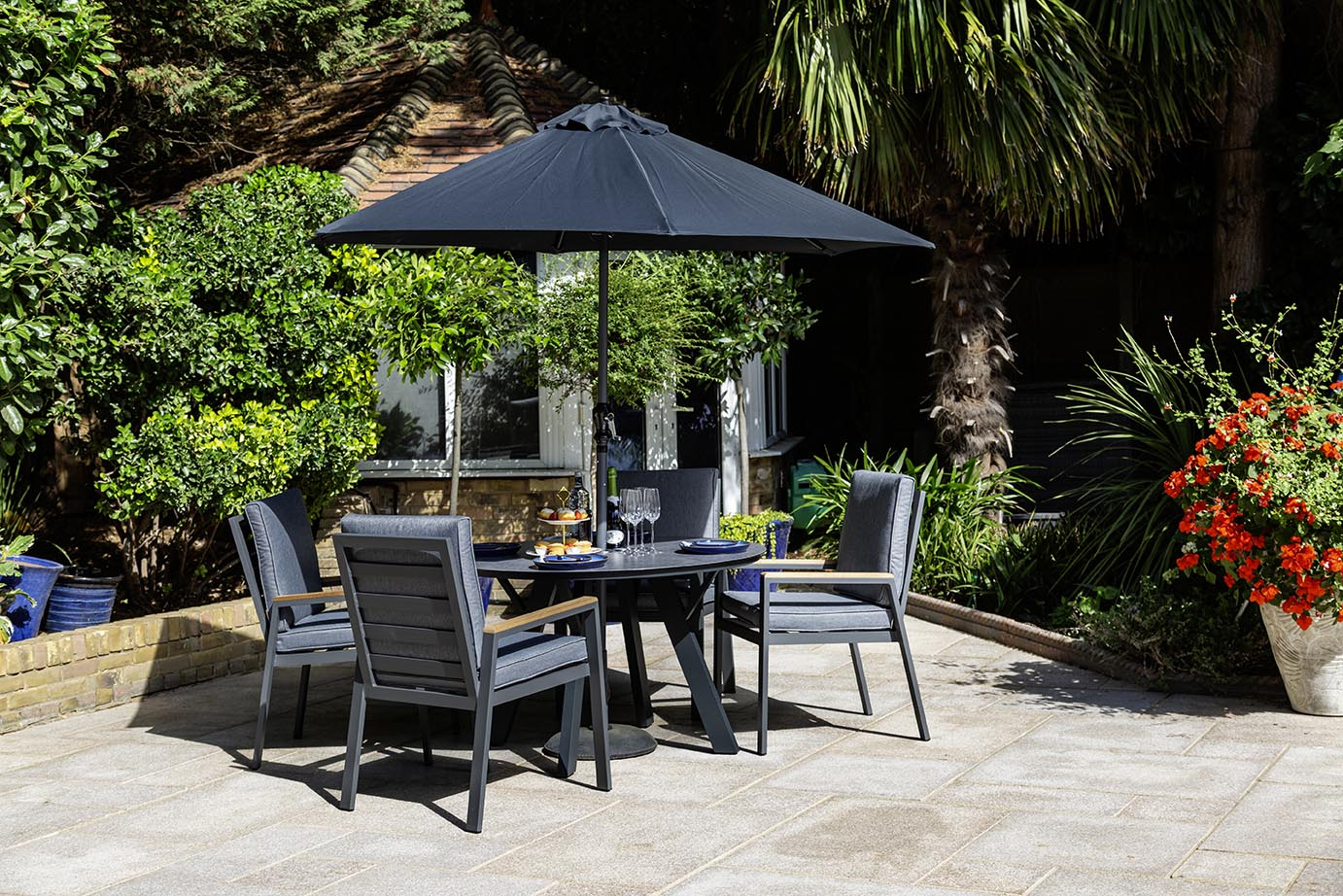 Built around a strong aluminium frame for durability and easy maintenance, the Knightsbridge design is finished with warm teak inlays on the arms – a subtle detail that enhances both texture and tone. The 120cm ceramic glass-topped table provides a smooth, contemporary surface that’s resistant to heat and easy to clean, while the included 2.5m parasol, 15kg base, and protective cover ensure comfort and protection throughout the seasons.