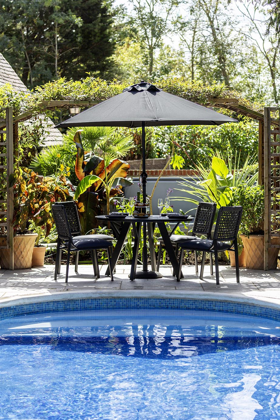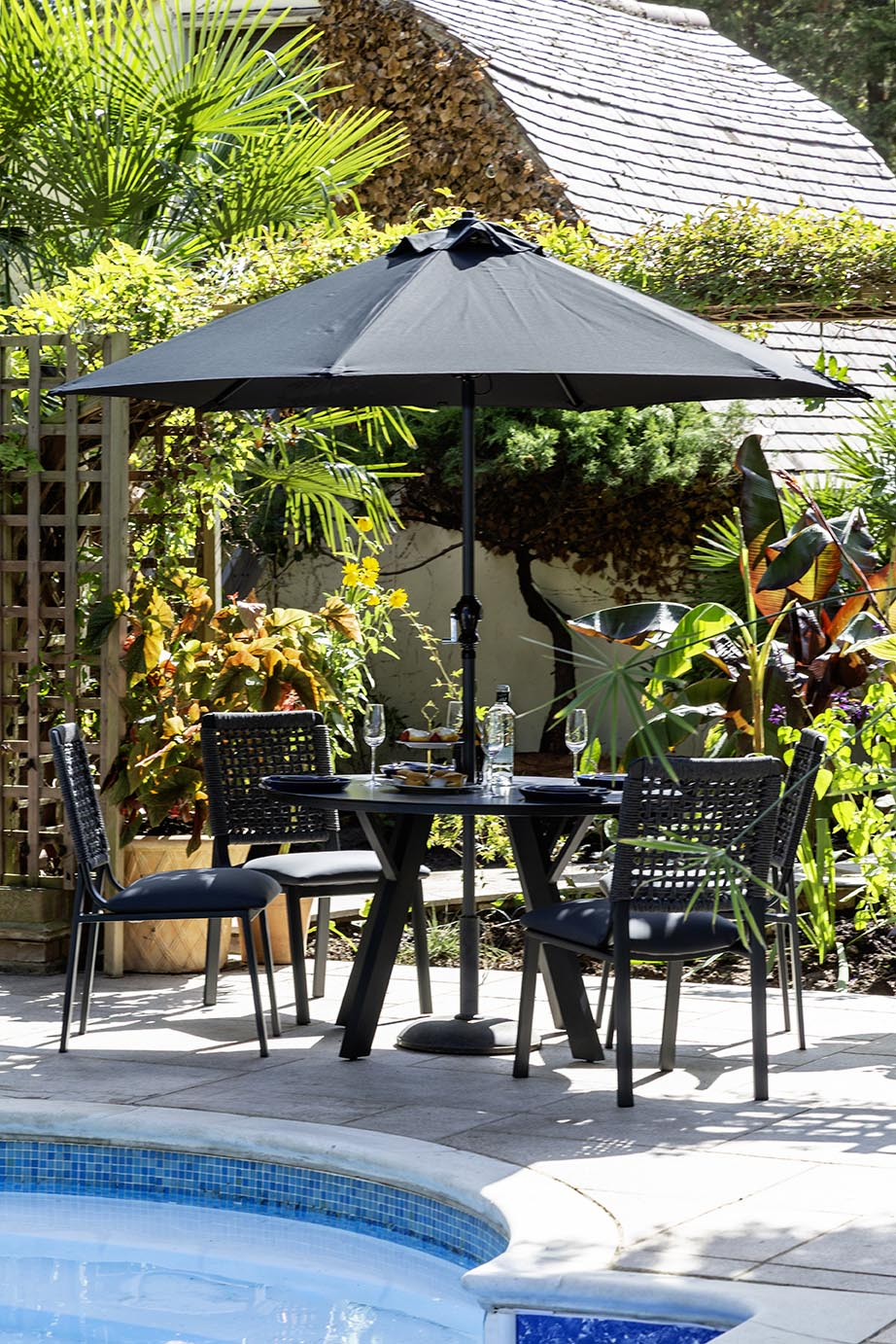 An elegant dining collection, featuring rope-backed chairs with deep Yacht Leather (PVC) cushions, paired with a 120 cm round table crowned with a smooth ceramic glass top. A 2.5 m parasol offers shade on brighter days, anchored by a sturdy 15 kg base, while a tailored protective cover ensures the set remains pristine between seasons. Crafted for style, comfort, and lasting enjoyment.