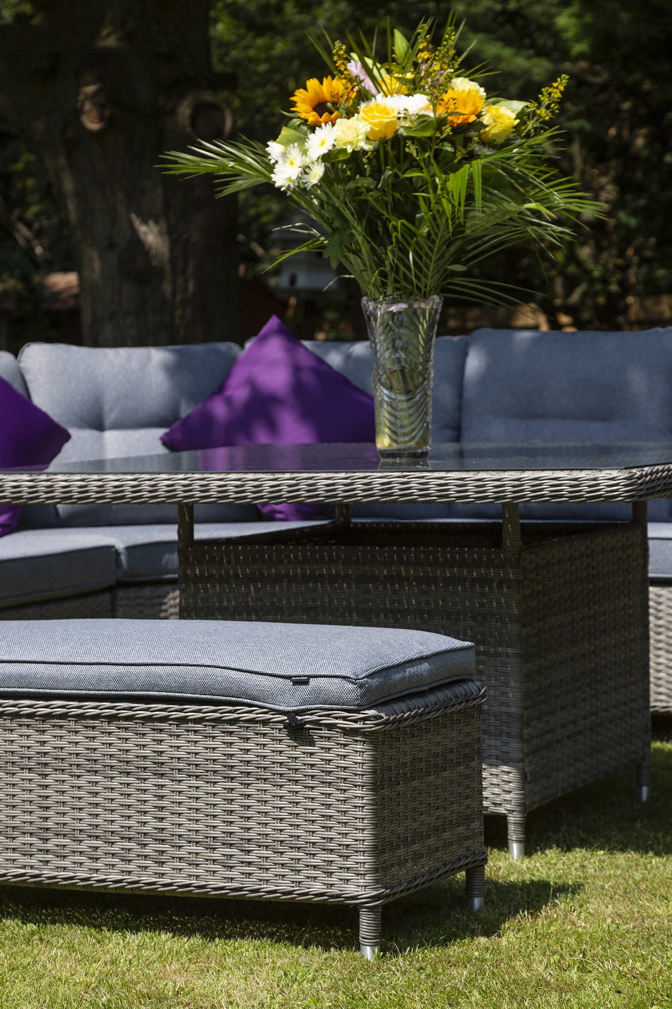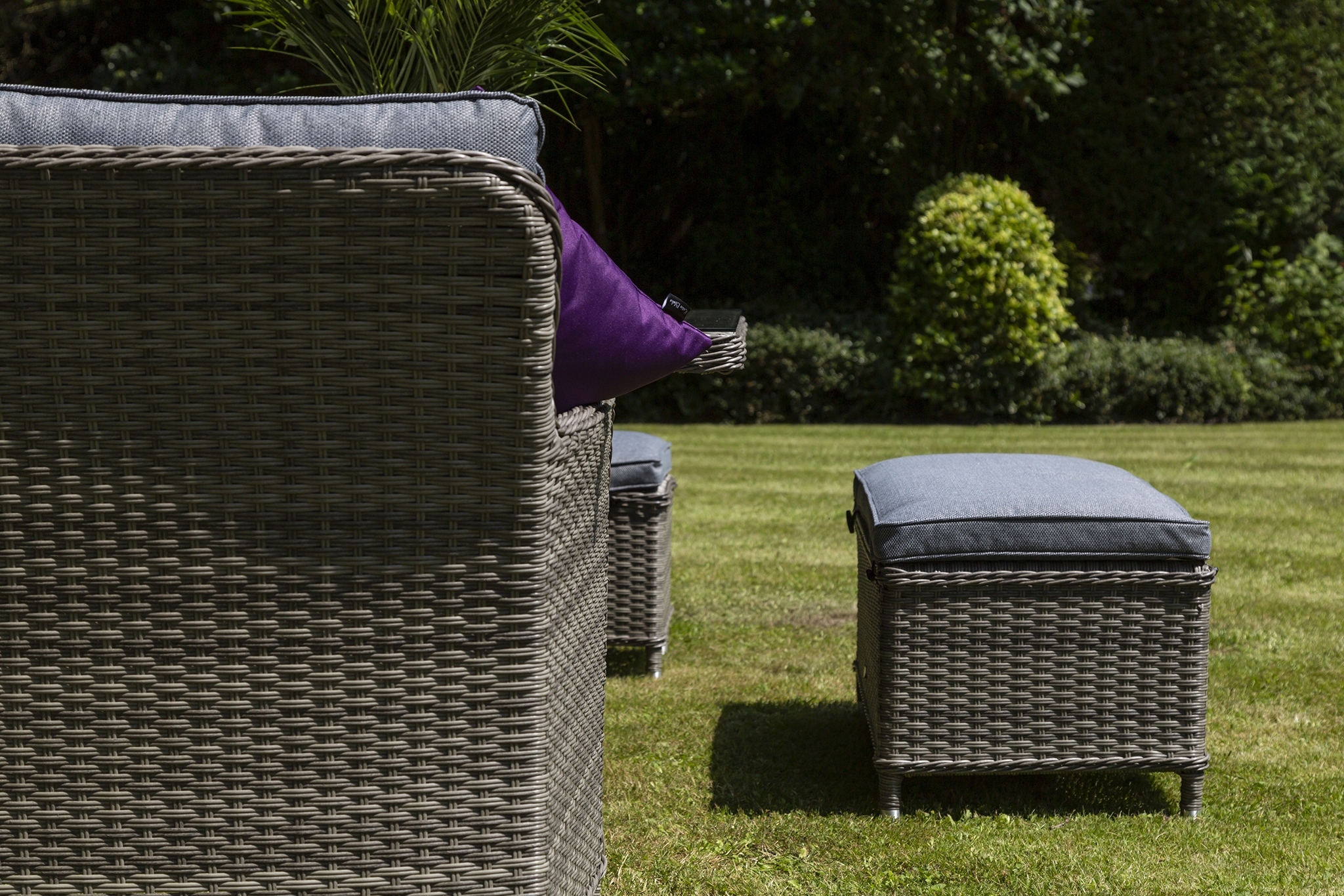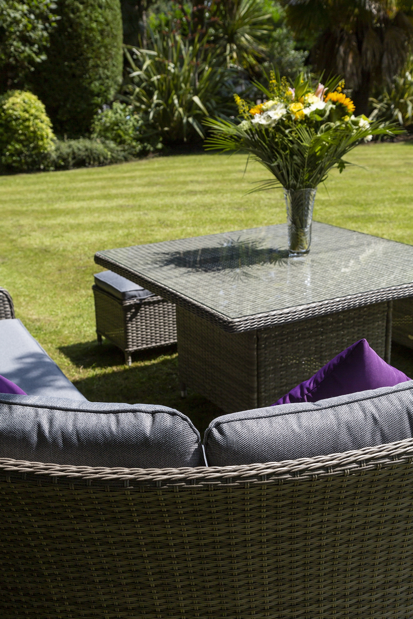 This large, curved corner set offers plenty of space for you and your guests to spread out, enjoy a relaxing day in the sunshine. With footstools to put your feet up or as additional seating and large 123cm square table, you have the ideal place to relax, entertain and host friends…