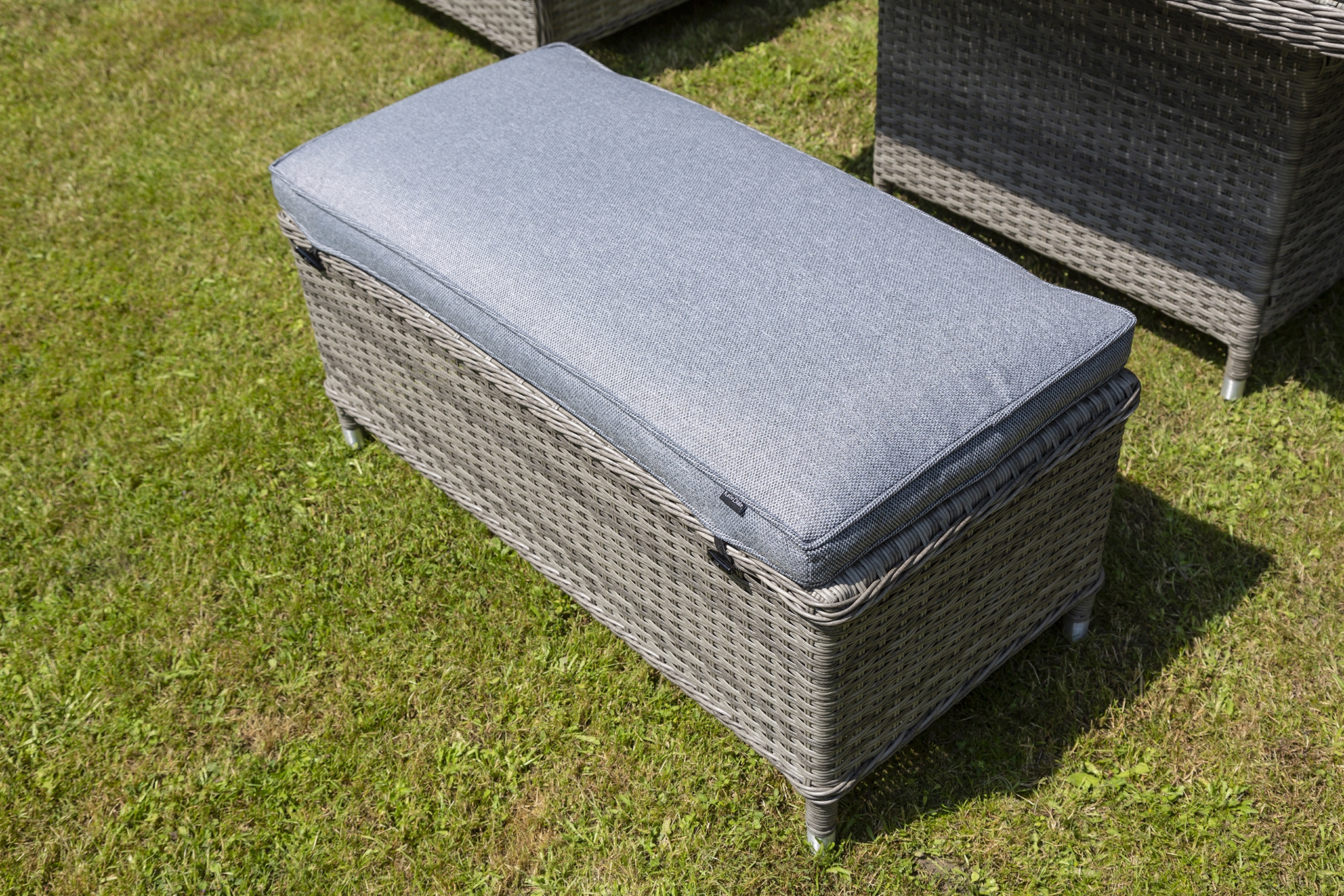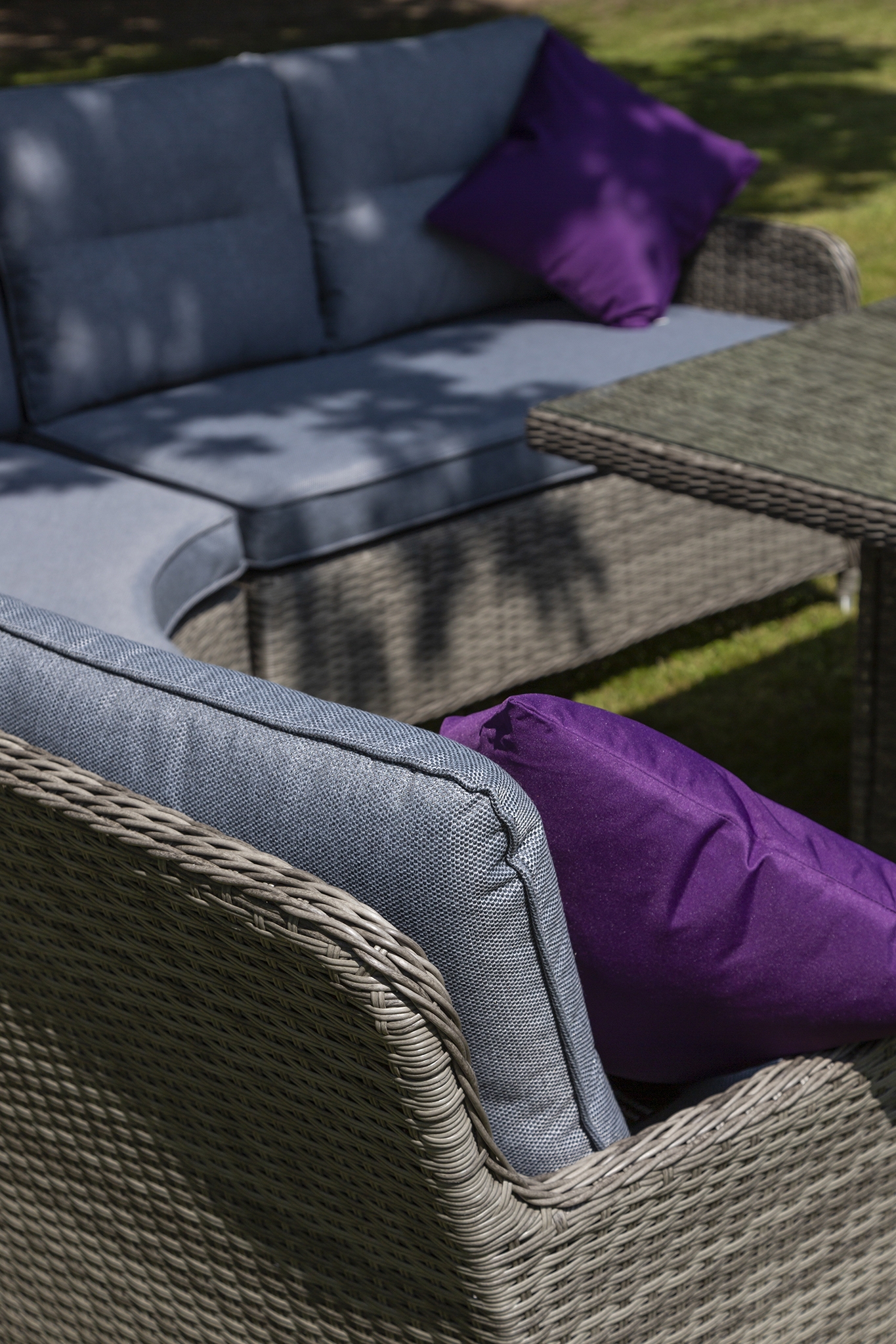 Contemporary design features soft grey colour weave handwoven on to lightweight aluminium frames complement grey/blue shower resistant cushions. Details such as the smooth rounded chair arm rests, softly curved cushion, full round twist weave edging increase quality, strength, durability and refinement.