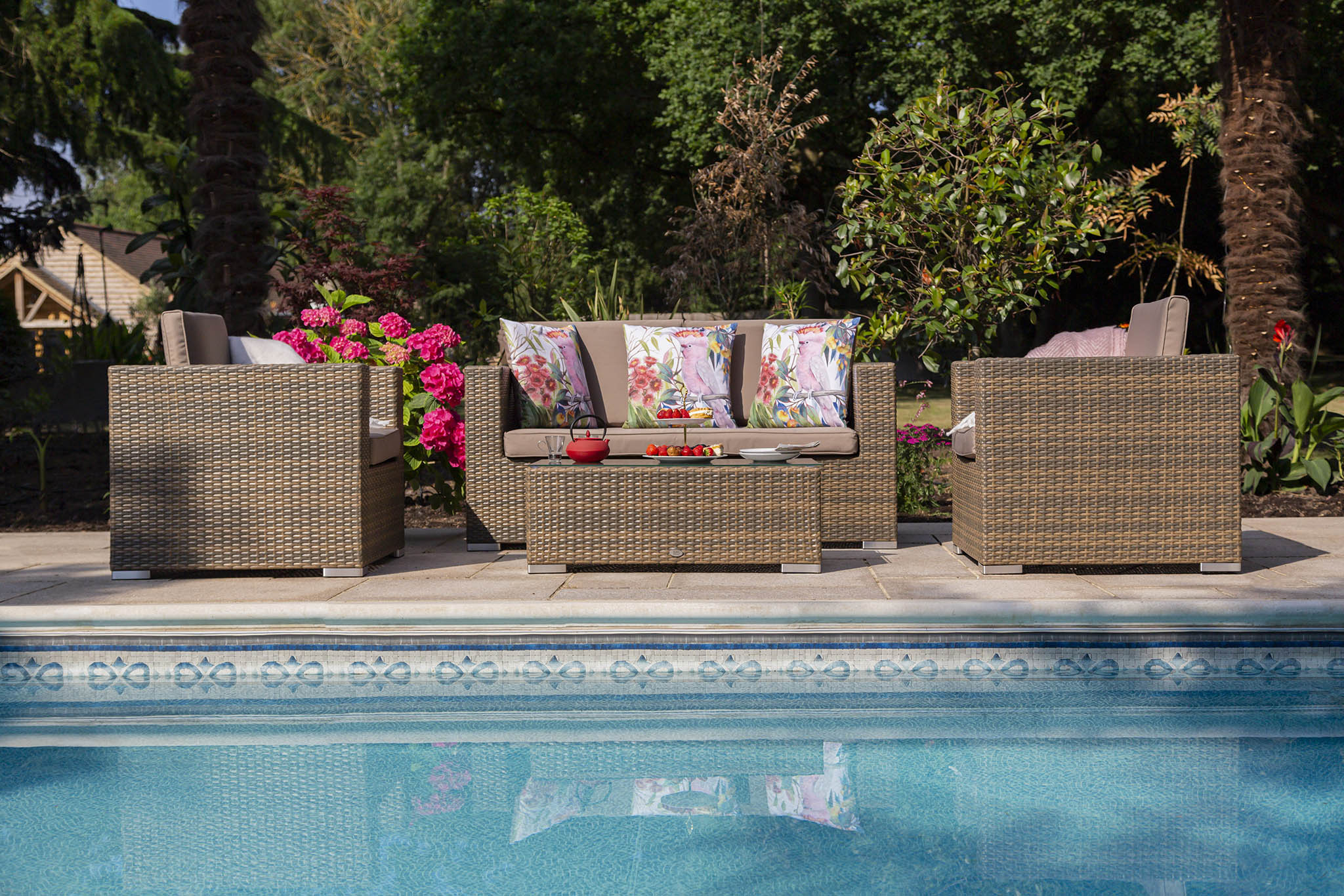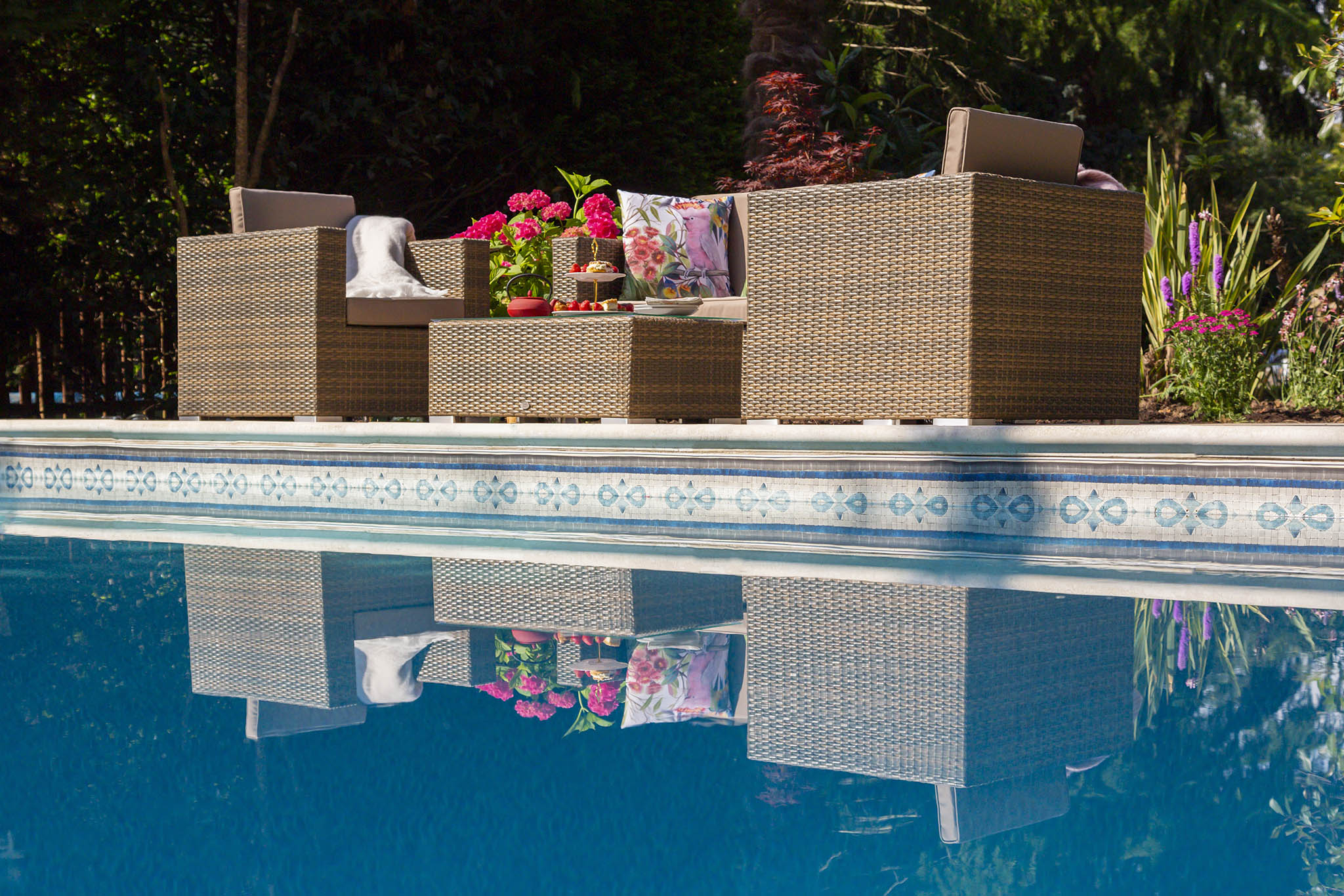 Durable flat weave handwoven on to lightweight aluminium frames complement 8mm plush shower resistant cushions.