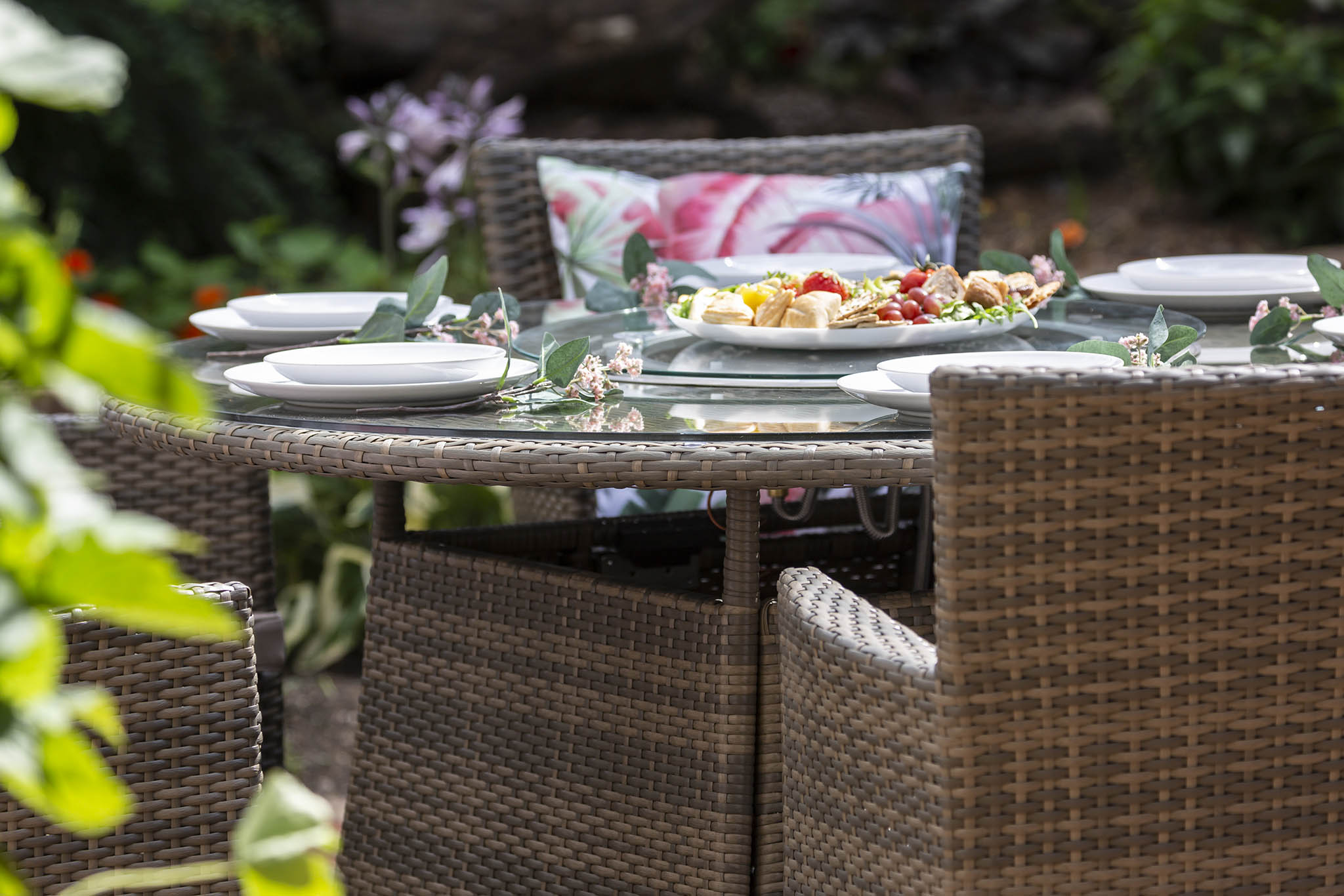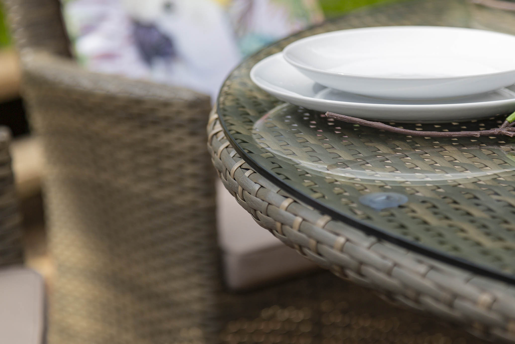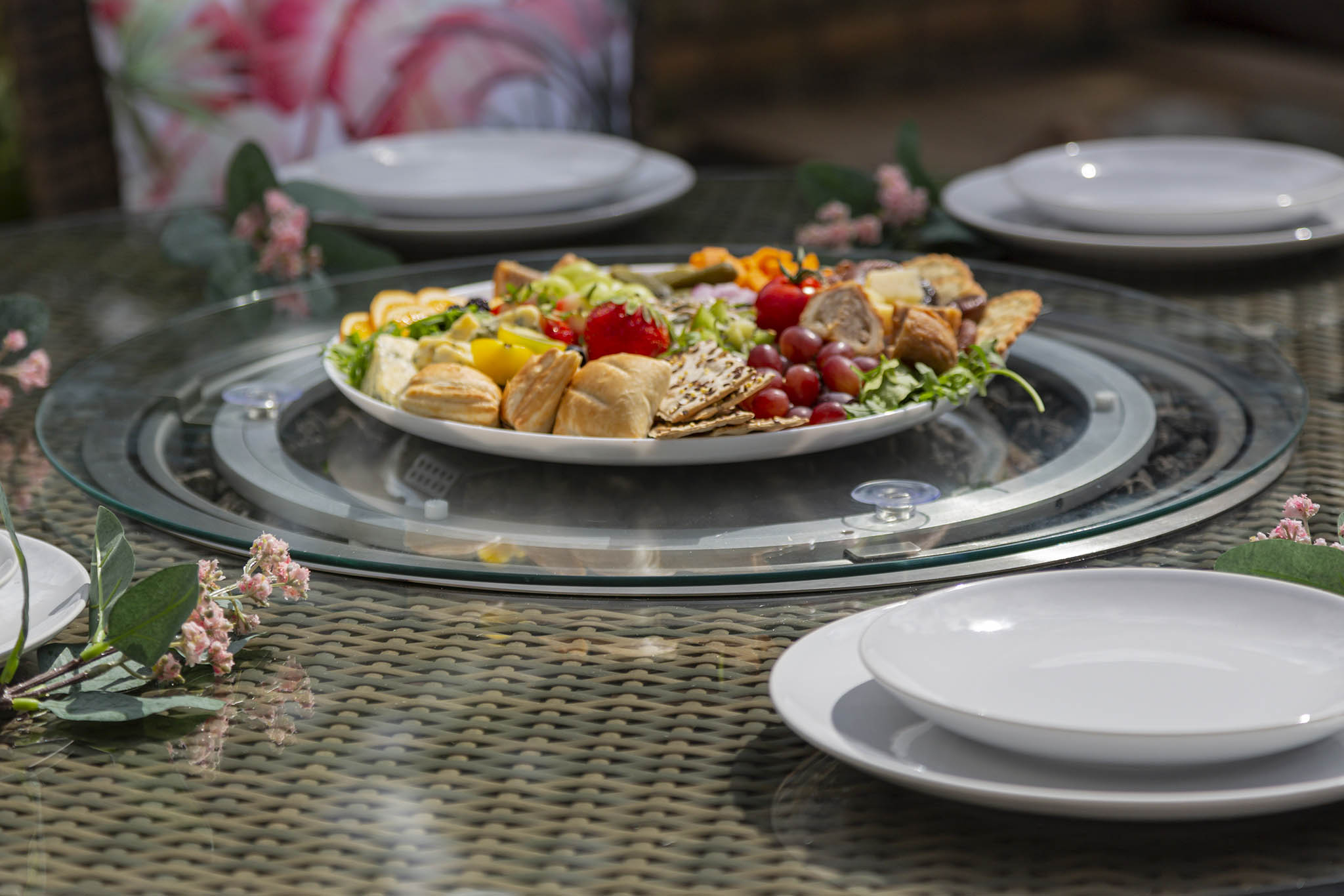 With a generous 135cm round table, which is topped with easy clean tempered safety glass, 6 guests can comfortably dine alfresco in style.