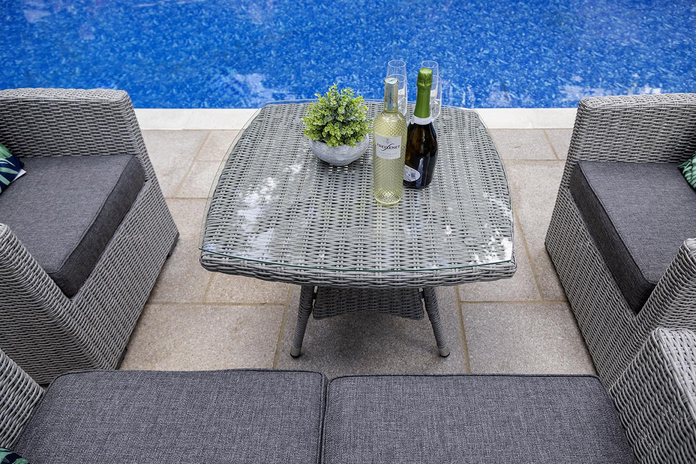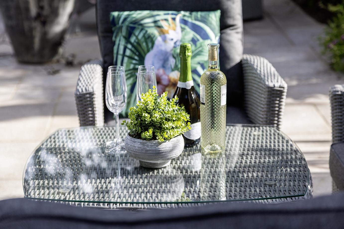The set includes a generously sized 80cm x 80cm table with a 5mm tempered glass top, providing a polished, practical surface for drinks, snacks, or decorative touches. Deep 10cm cushions on the sofa and armchairs offer luxurious comfort, inviting you to linger and enjoy your garden space. A tailored protective cover ensures the set remains in pristine condition all year round.