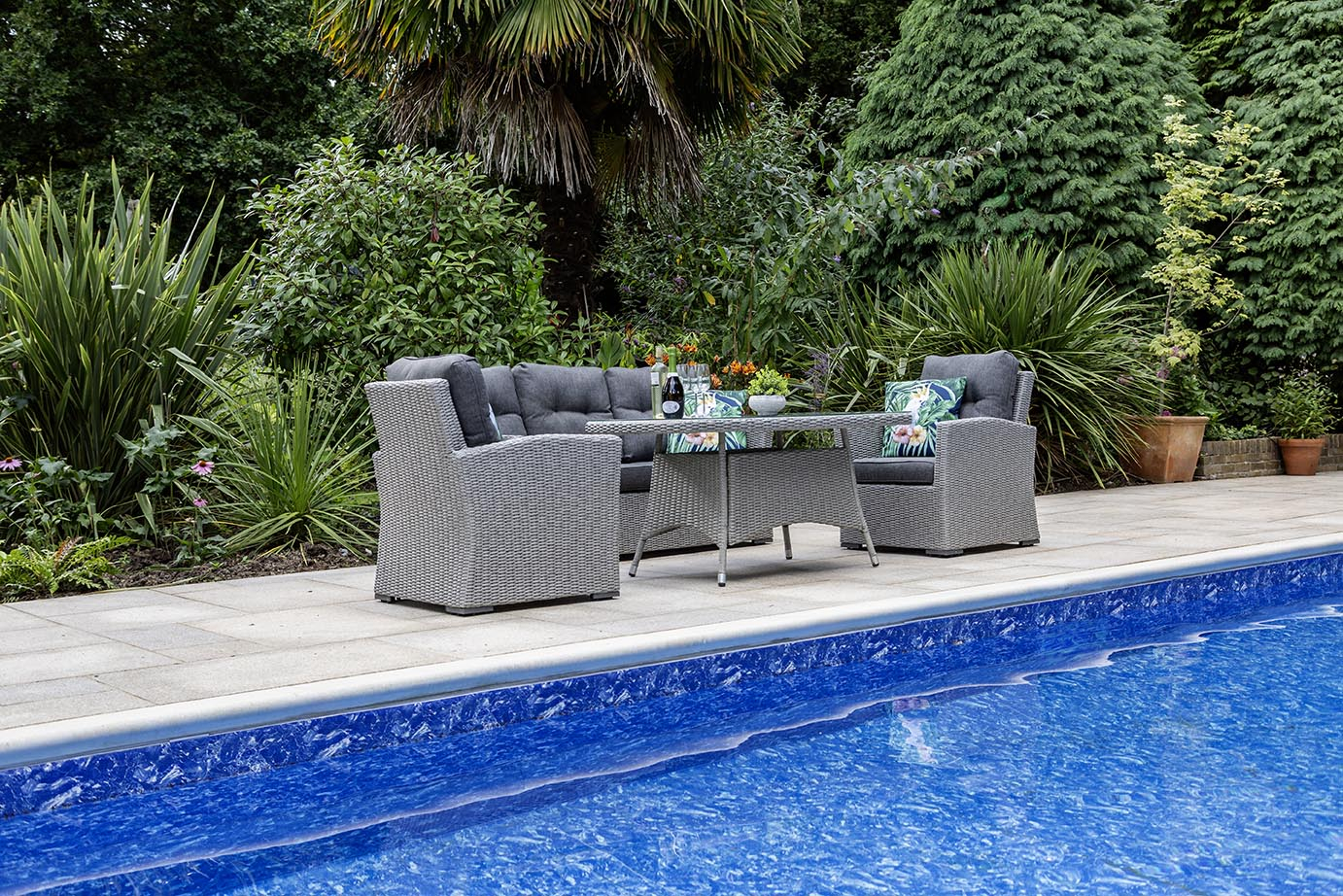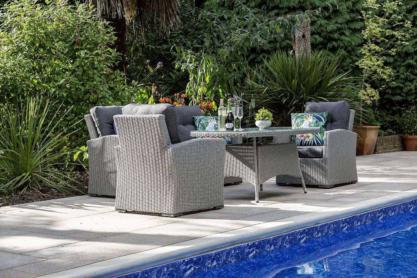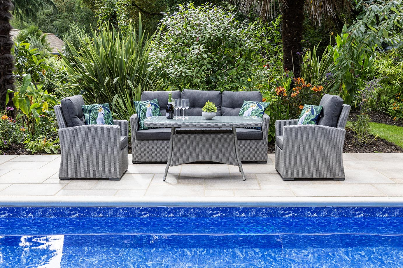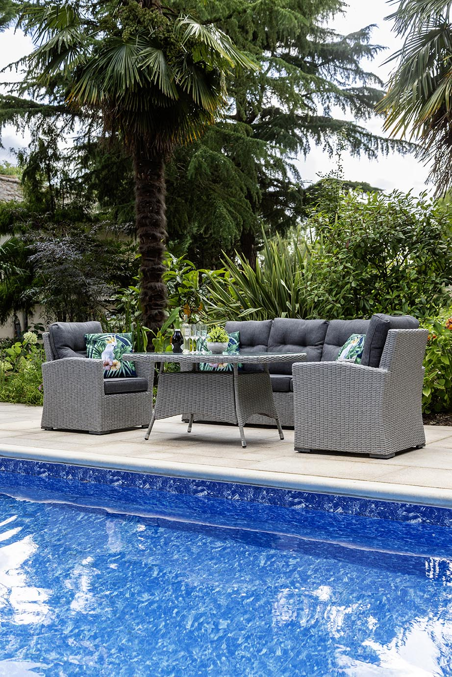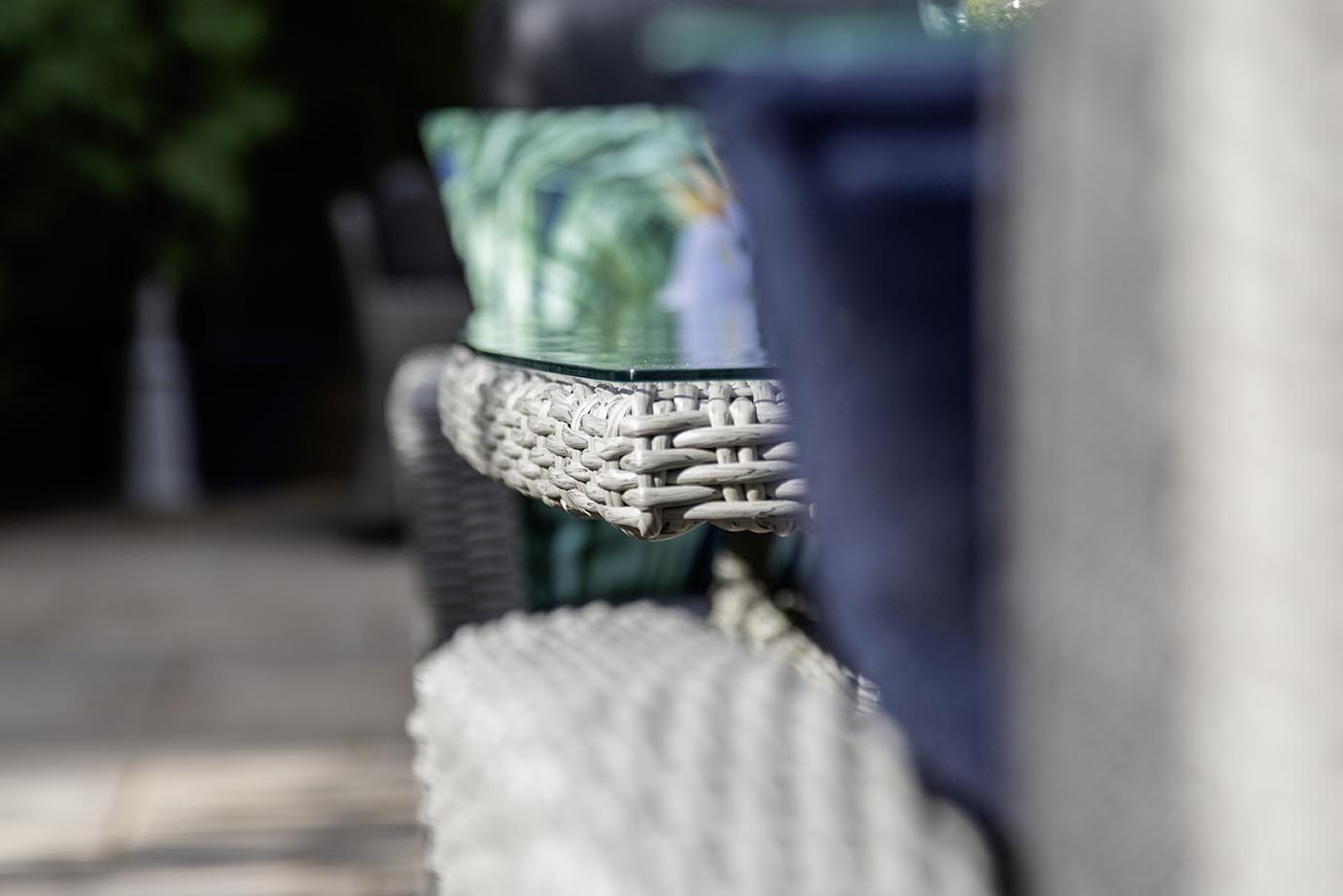 The set features a 140cm x 80cm table with a 5mm tempered glass top, providing ample surface space for drinks, snacks, or decorative touches. All seating comes with 10cm deep cushions, ensuring exceptional comfort for long, leisurely afternoons. A tailored protective cover completes the set, protecting your investment year-round.