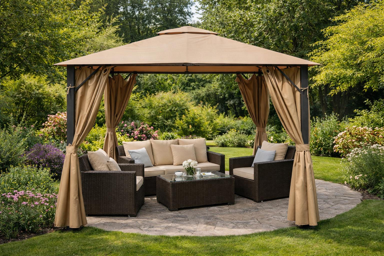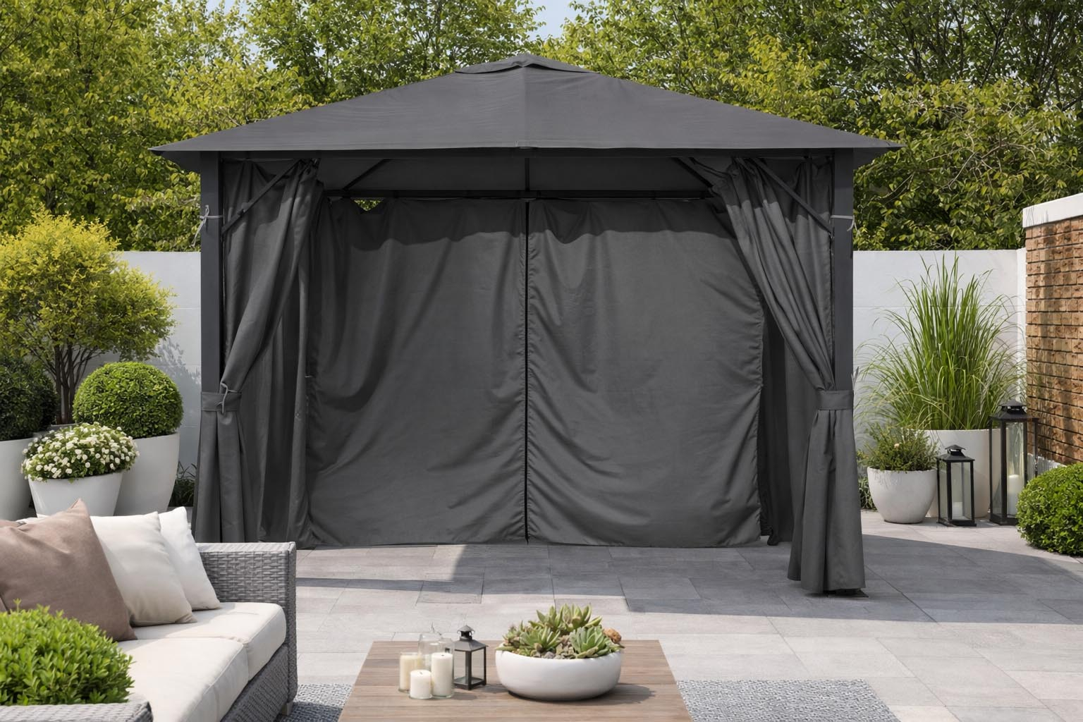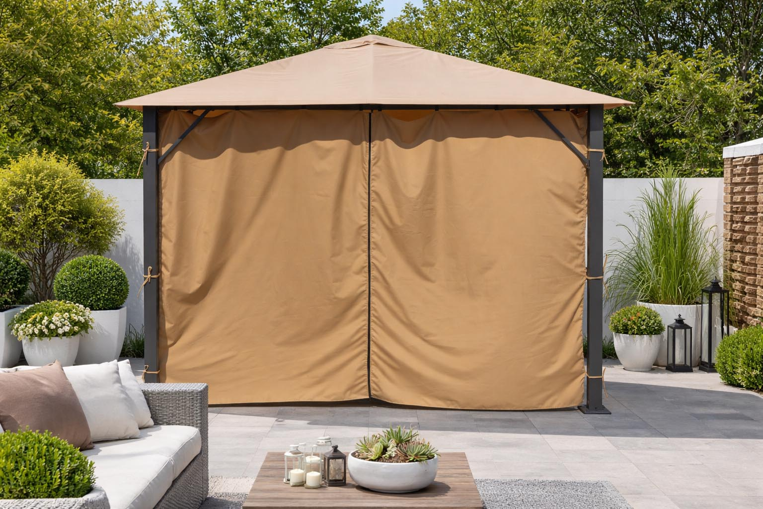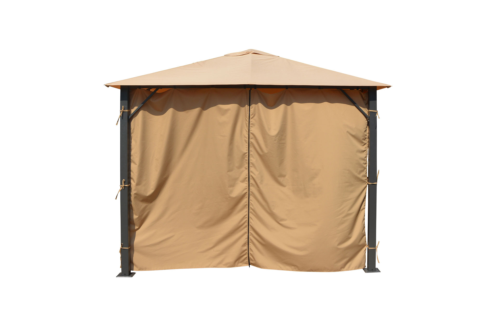 - Waterproof polyester privacy curtains can be used all the way around the gazebo